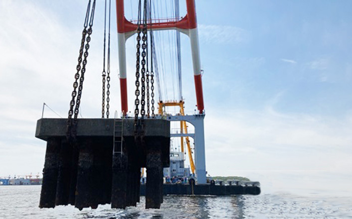 東京港の12号地木材投下泊地において、現在供用中止となっているドルフィン(係留施設)を起重機船を使用して撤去しました。